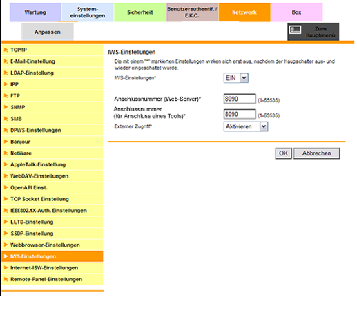 In diesem Bildschirm können Sie auswählen, ob IWS (Internal Web Server) verwendet werden soll. Mit der IWS-Funktion kann eine Umwandlungsanwendung für Druckdaten auf das System übertragen werden, wodurch die Umwandlungsfunktion für Druckdaten und andere Funktionen genutzt werden können.