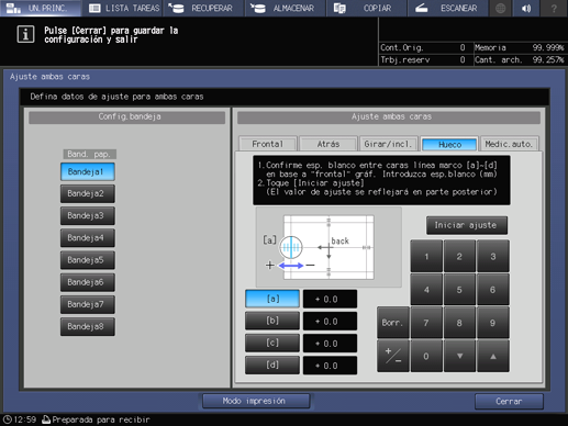 Introduzca los datos de ajuste adquiridos mediante la impresión de una tabla y la medición de la separación entre las caras frontal y posterior en los puntos de medición de la cara posterior.