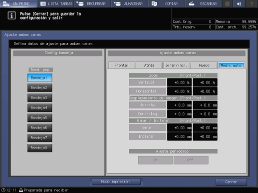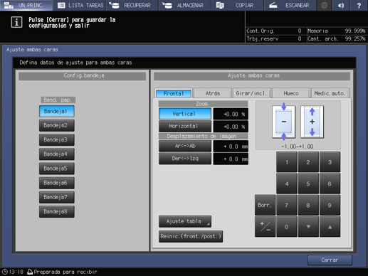 La ampliación y la posición de impresión en dirección vertical y horizontal pueden ajustarse con precisión en las caras tanto frontal como posterior. Como los datos de ajuste se pueden introducir directamente como valores porcentuales o numéricos para desplazar la posición, resulta práctico para efectuar el ajuste fino después de los ajustes de Med.escan., Hueco o Ajuste tabla o cuando tenga a mano un resultado de la impresión a dos caras.