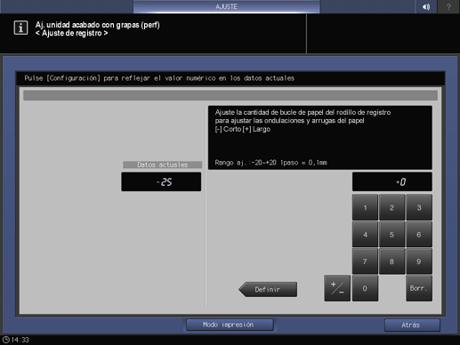 • Pulse +/-, 2, 5 y Definir para introducir el valor -25. Esto reduce 2,5 mm la deflexión del papel del rodillo de registro.