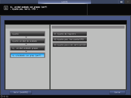 5. Pulse Aj. unidad acabado grapas (perf) en el menú Aj. unidad acabado grapas.