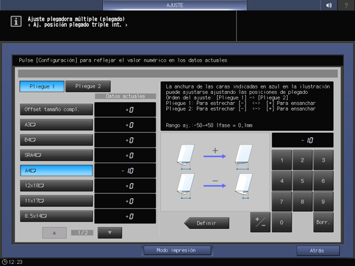Seleccione el tamaño de papel y pulse Pliegue 1 o Pliegue 2. Introduzca el valor de ajuste y pulse Definir.