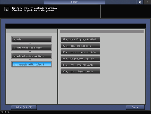 Pulse Ajuste plegadora múltiple en el menú Ajuste unidad de acabado.