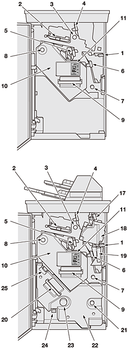 25 | Palanca [SD7] | Se abre hacia arriba para retirar el papel atascado después de extraer la unidad de acabado. |