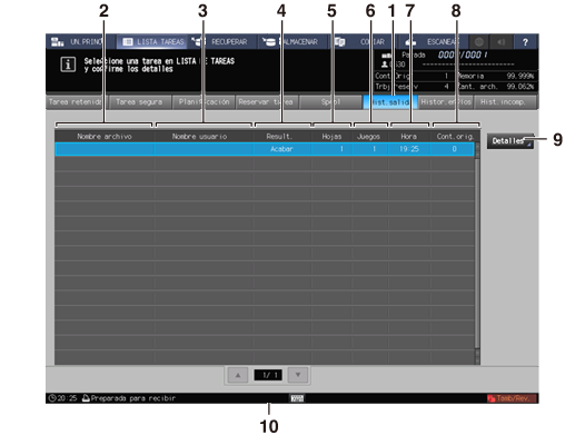 9 | Detalles | Se pulsa para comprobar los detalles de una tarea después de seleccionarla en la lista. Se muestra la pantalla Detalles de ticket de la tarea seleccionada. |