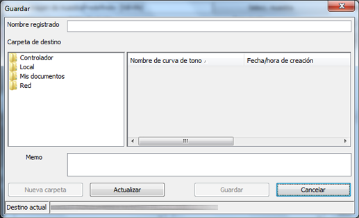 Si selecciona Controlador como carpeta de destino, la curva de tono se guarda en el controlador de imagen.