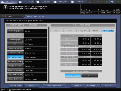 En la pantalla UN. PRINC., pulse Ajuste - Ajuste de calidad - Ajuste ambas caras periódico de forma consecutiva y asigne a Aj.autom.amb.caras periód. el valor Activado. A continuación, puede asignar a Ajuste periódico el valor Activado u Desactivado. La bandeja con valor Activado tiene disponible la opción Ajuste periódico. Para obtener más información, consulte Ajuste ambas caras periódico.