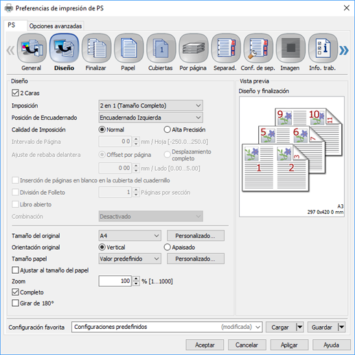 Haga clic en la ficha Diseño y, a continuación, configure cada elemento. Después de la configuración, haga clic en Aceptar.