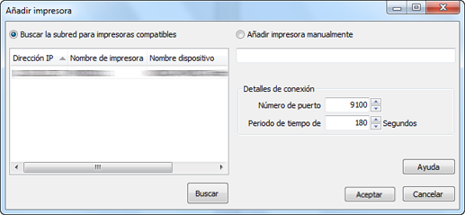 explicación adicionalSi no se muestra ninguna impresora, especifique Puerto y Tiempo de espera de activación en Detalles de conexión y después haga clic en Buscar otra vez