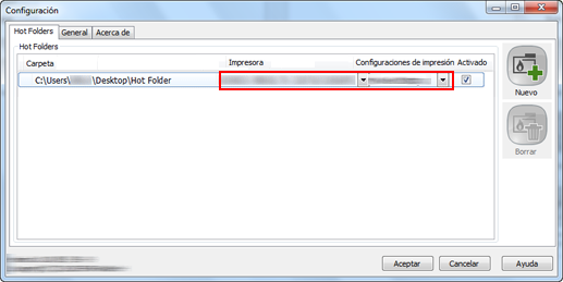 En Hot Folders, seleccione la Hot Folder de destino. En Impresora y Configuración de impresión, seleccione la impresora requerida para la Hot Folder y haga clic en Aceptar.