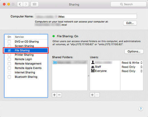 Seleccione la casilla de verificación File Sharing en Service y después cierre la ventana.