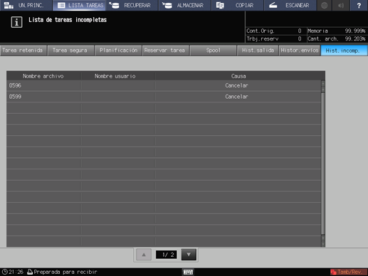 Pulse LISTA TAREAS y, a continuación, pulse Hist.incomp.