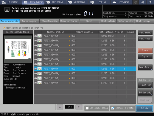 explicación adicionalPara las tareas creadas por esta máquina, como las tareas de copia y tareas guardadas, el icono máquina se muestra en la parte izquierda de la pantalla de vista previa. El icono máquina no se muestra para las tareas de impresión enviadas desde un ordenador.