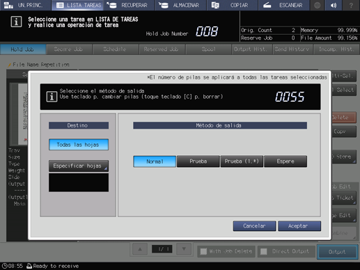 explicación adicionalPara indicar el destino, seleccione la hoja de salida en Todas las hojas o Especificar hojas. Si se selecciona una tarea retenida que se ha movido desde la lista de tareas reservadas o si se seleccionan varias tareas, Especificar hojas no está disponible.