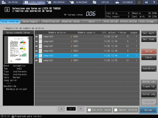 explicación adicionalPara las tareas creadas por esta máquina, como las tareas de copia y tareas guardadas, el icono máquina se muestra en la parte izquierda de la pantalla de vista previa. El icono máquina no se muestra para las tareas de impresión enviadas desde un ordenador.