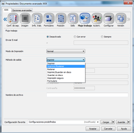 En el menú desplegable Método de salida, seleccione Guardar en disco duro, Guardar en disco duro/imprimir, Guardar en disco duro/imprimir (prueba), Guardar en disco duro/imprim. (prueba/1.ª) o Guardar en disco duro/imprimir (esperar).