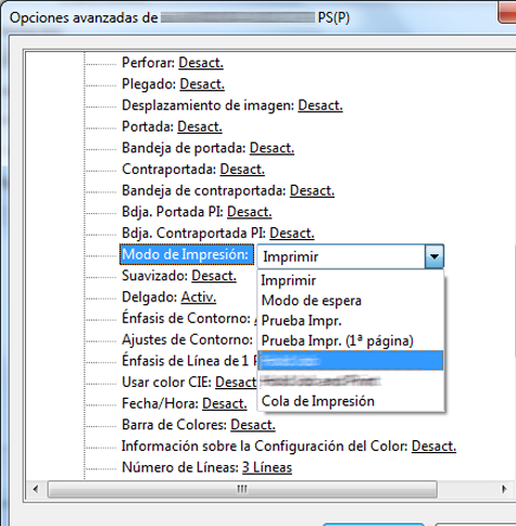 Si selecciona Retener o Retener (sin RIP), el Modo de Impresión solo puede ser Normal. Si se selecciona Imprimir/Retener, estarán disponibles todas las opciones en Modo de Impresión, excepto Cola de Impresión.