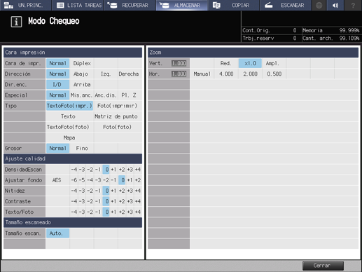 explicación adicionalÁrea izquierda de la pantalla Modo Chequeo: muestra la configuración actual de Cara impresión, Ajuste de calidad y Tamaño escaneado.