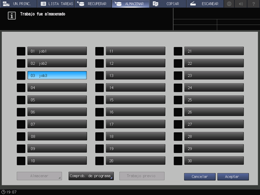 La configuración de guardado registrada se recupera y se visualiza la pantalla ALMACENAR.