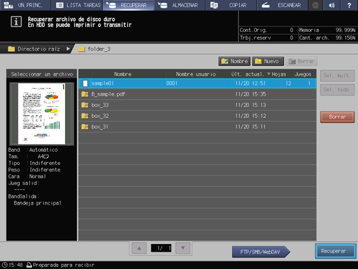 explicación adicionalSeleccione el directorio (directorio raíz, carpeta, cuadro de usuario) del disco duro en el que se almacena la tarea. Si la carpeta o el cuadro de usuario están protegidos mediante contraseña, introduzca la contraseña.