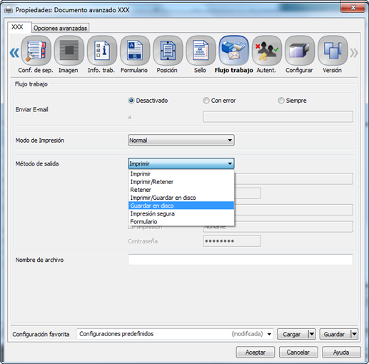 En el menú desplegable Método de salida, seleccione Guard. en cuadro usu., Guard. en usu. e impr, Guardar en buzón de usuario/imprimir (prueba), Guardar en buzón de usuario/imprim.(prueba/1.ª) o Guardar en buzón de usuario/imprimir (esperar).