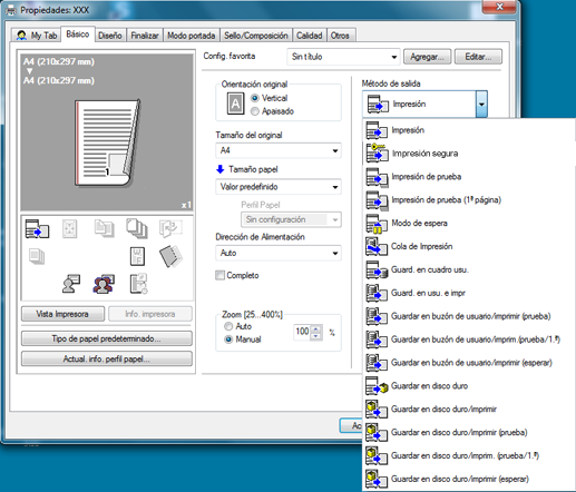 Método de salida: Guard. en cuadro usu., Guard. en usu. e impr, Guardar en buzón de usuario/imprimir (prueba), Guardar en buzón de usuario/imprim.(prueba/1.ª) y Guardar en buzón de usuario/imprimir (esperar)