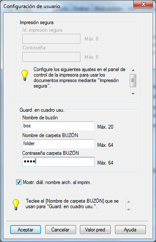 explicación adicionalEscriba el Nombre de carpeta y la Contraseña especificadas en la pantalla RECUPERAR de esta máquina para guardar una tarea de impresión en el disco duro. Para guardar una tarea de impresión en el Buzón de usuario, indique el Nombre de buzón.