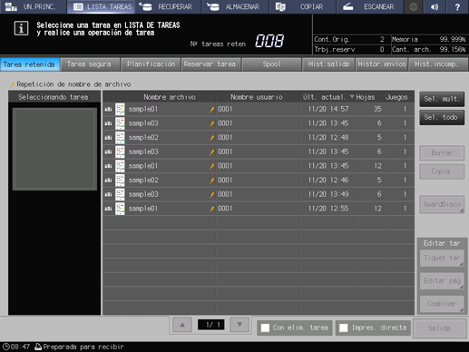Compruebe la información sobre los trabajos en curso, los trabajos detenidos y los trabajos en reserva en la lista que aparece en pantalla.