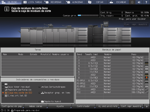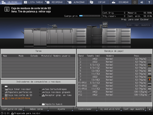 Pulse el indicador de C.res.cort.SD llena situado en el área de indicadores de consumibles y residuos de la pantalla UN.PRINC.