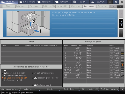 Cuando se llena el depósito de residuos de corte de SD de la grapadora en lomo SD-513, se muestra el siguiente mensaje en el área correspondiente de la pantalla.