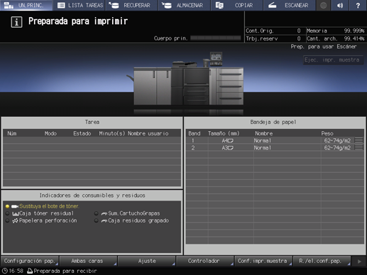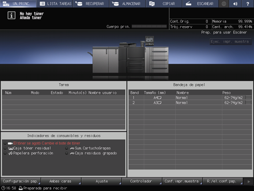 Cuando se vacía el bote de tóner y baja el nivel de tóner en la tolva de tóner, el indicador del bote de tóner que se muestra en el área Indicadores de consumibles y residuos de la pantalla UN.PRINC. se ilumina en amarillo y se visualiza el mensaje Sustituya el bote de tóner.