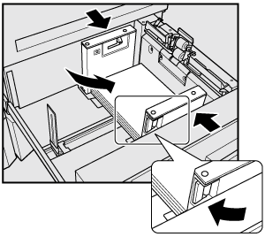 explicación adicionalColoque unas 100 hojas de papel con la cara de impresión hacia abajo. Mientras empuja la palanca de liberación del bloqueo de la placa de guía lateral frontal, alinee las dos placas de guía laterales con el papel para el posicionamiento.