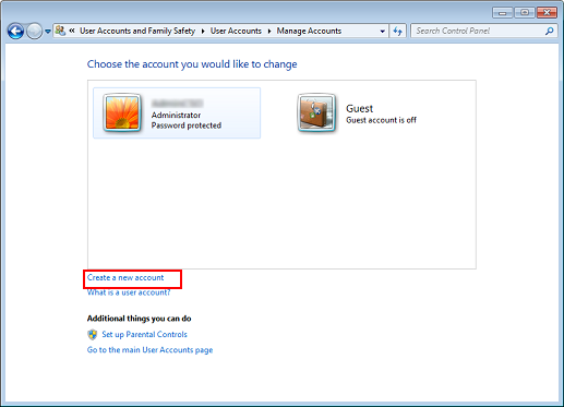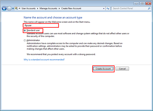 Introduzca un nombre de cuenta y verifique que esté seleccionada la opción Usuario estándar y, a continuación, haga clic en Crear cuenta.