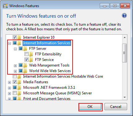 Haga clic en Internet Information Services y Servicio FTP y haga clic en Aceptar.