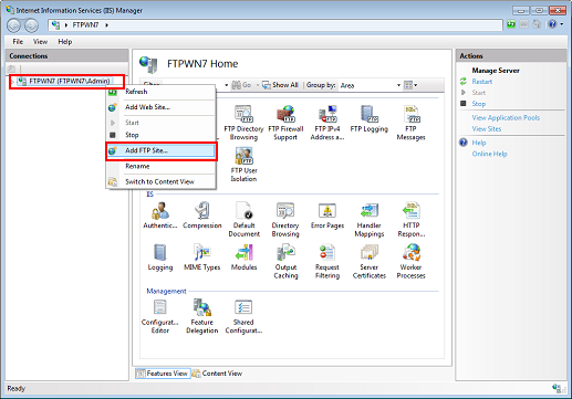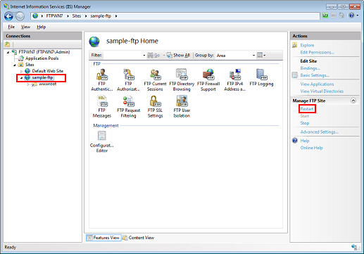 Seleccione el sitio FTP y, a continuación, haga clic en Reinicio.