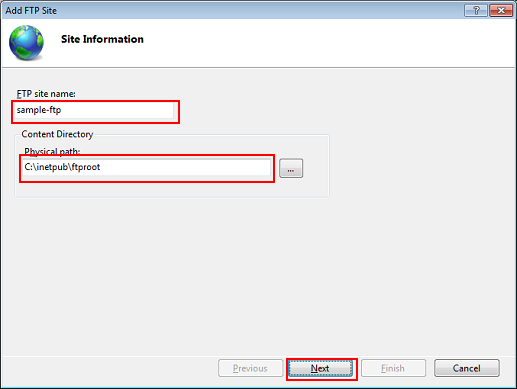 Introduzca el nombre del sitio FTP y el directorio de contenido y, a continuación, haga clic en Siguiente.