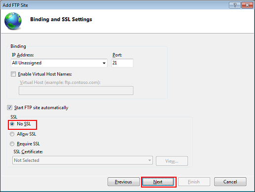 Seleccione Sin SSL en SSL y, a continuación, haga clic en Siguiente.