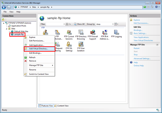 Abra Sitios en la lista de conexiones de la izquierda de la pantalla y haga clic con el botón derecho del ratón en el sitio FTP que ha creado y, a continuación, haga clic en Agregar directorio virtual.