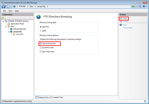Marque Directorios virtuales en Opciones del listado de directorios y, a continuación, haga clic en Aplicar.