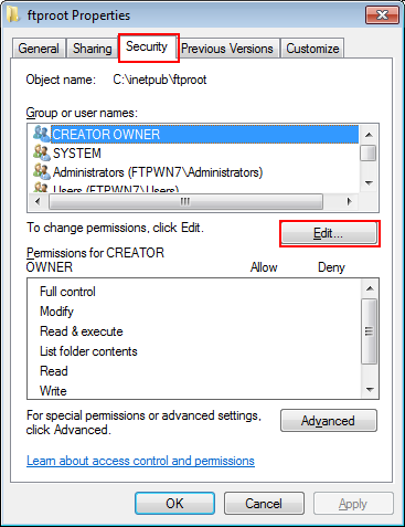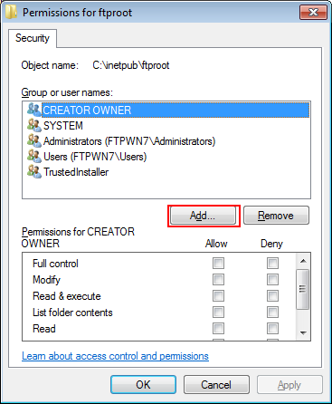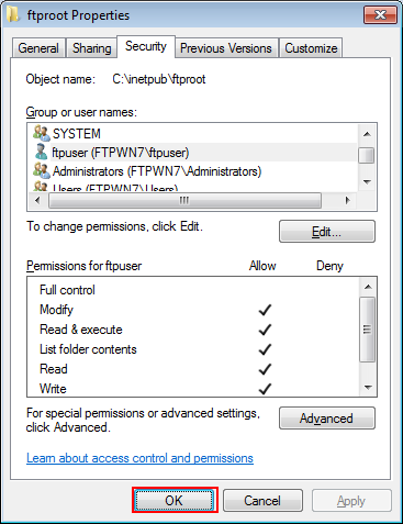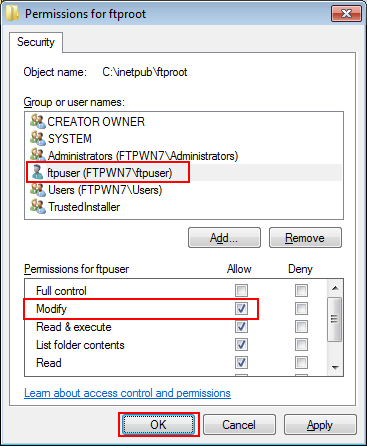 Ejemplo: se concede permiso de acceso a FTPWN7\ftpuser.