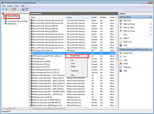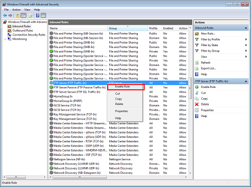 Haga clic con el botón derecho del ratón en Servidor FTP (entrada de tráfico FTP) y haga clic en Habilitar regla.