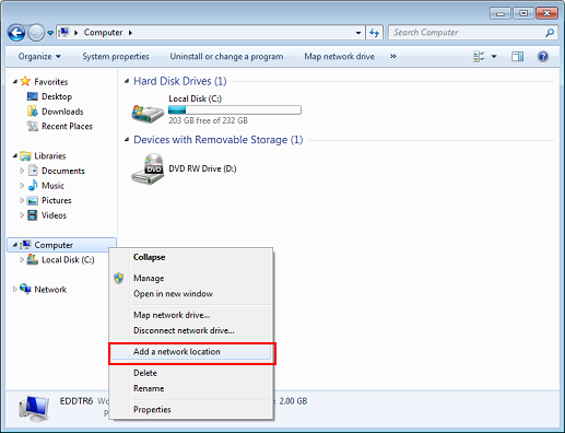 Haga clic con el botón derecho del ratón en Equipo y haga clic en Agregar una ubicación de red.