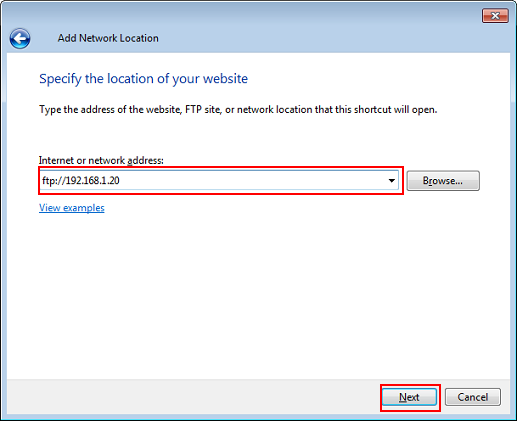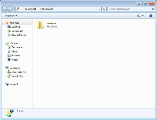 Red | La máquina y el ordenador que aloja el sitio FTP (Windows 7) están conectados a la red de área local. |