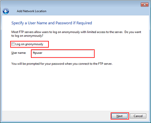 Elimine la marca de Iniciar sesión de forma anónima e introduzca el nombre de usuario y, a continuación, haga clic en Siguiente.