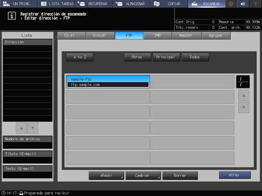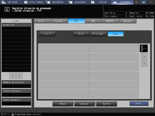 explicación adicionalDespués de pulsar ESCANEAR, pulse FTP para que se muestre esta pantalla.