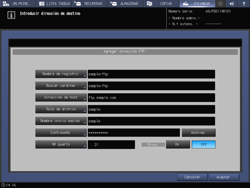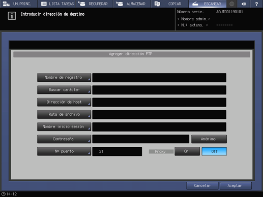 explicación adicionalPara utilizar un servidor proxy al enviar al servidor FTP, ajuste Proxy en On. En este caso, establezca con antelación una configuración del servidor proxy en UTILIDAD. Para obtener más información sobre Configuración de red, consulte Configuración de NIC.