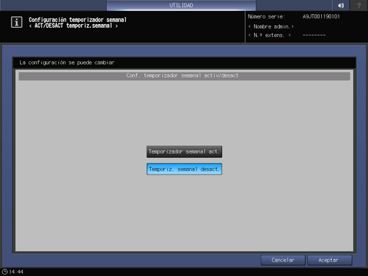 Pulse Configuración sistema en la pantalla Menú Configuración administrador máquina y, a continuación, pulse Conf. temporizad. semanal y Act./desac. temp. semana de forma consecutiva.