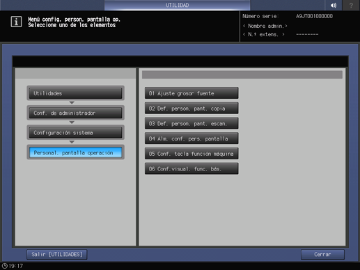 Pulse Configuración sistema en la pantalla Menú Configuración administrador máquina y, a continuación, pulse Personal. pantalla operación y Alm. conf. pers. pantalla de forma consecutiva.