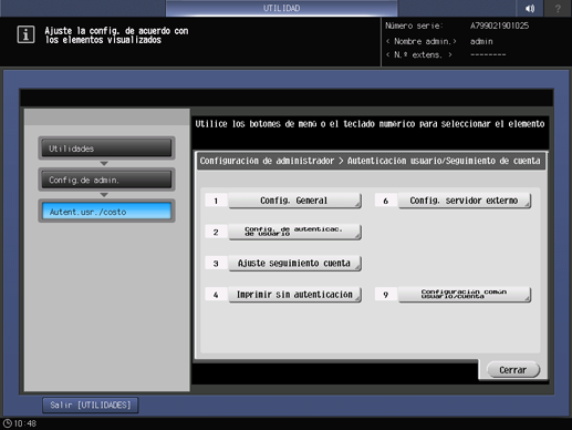 Pulse Autent.usr./costo en la pantalla Menú Configuración administrador máquina y, a continuación, pulse Config. usuario/cuenta común.