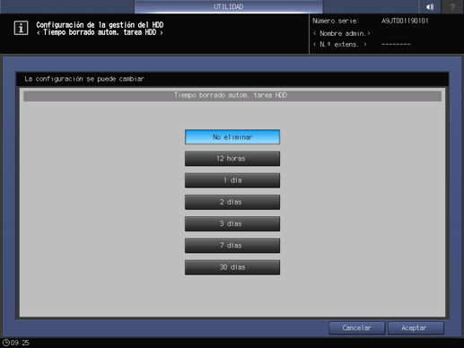 explicación adicionalSe visualiza la pantalla Tiempo borr. aut. tarea HDD.